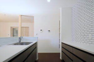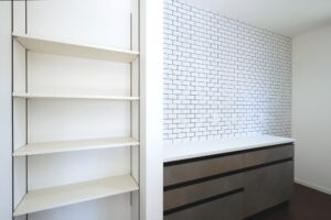 ・キッチン背面のタイルと、使い勝手のいい造作棚