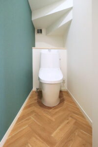 ・ヘリンボーン調の床がアクセントの清潔感あふれるトイレ