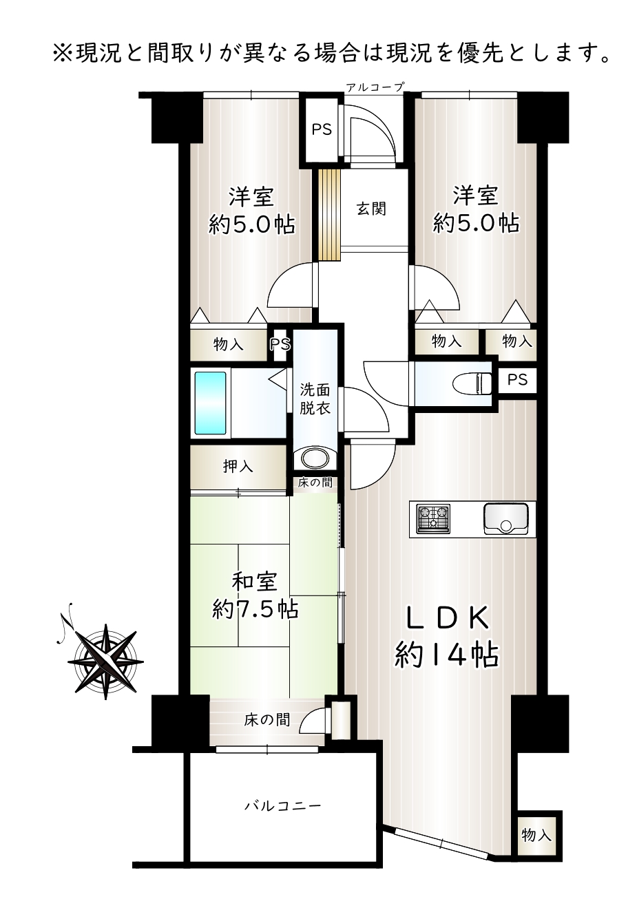| 間取り | 3LDK | 間取り内訳 | LDK14 洋室5 洋室5 和室7.5 |